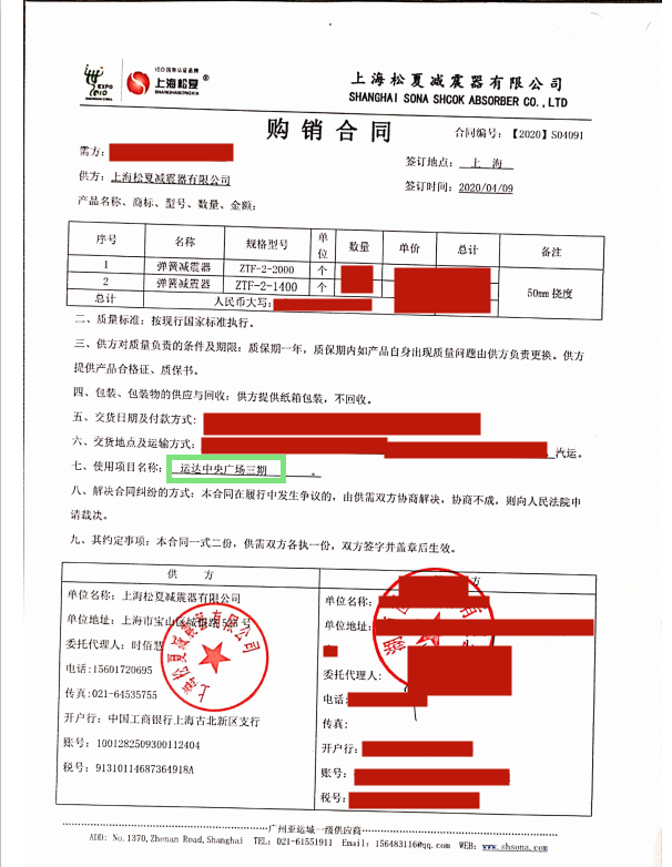 上海松夏减震器有限公司官方网站为您介绍:【长沙运达广场项目】使用ZTF可调式弹簧减震器采购合同信息,我们松夏公司2020年为【长沙运达广场项目】使用ZTF可调式弹簧减震器,起到了减震和降噪的作用,以下是【长沙运达广场项目】使用ZTF可调式弹簧减震器采购合同介绍