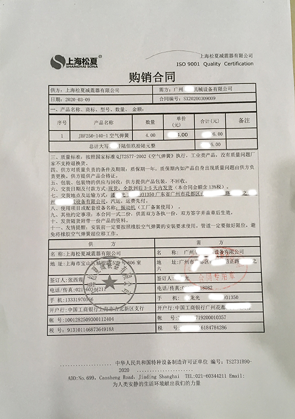 气动直线振动器用橡胶空气弹簧减震器合同案例